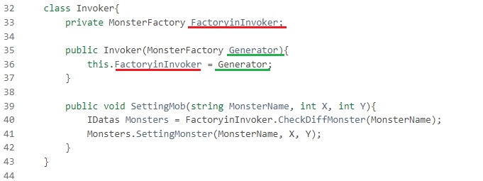 그리고 나서 이 몬스터 팩토리를 이전에 client 클래스에 해당했었는 invoker 클래스를 선언해 주도록 하고, 여기서 어떻게 작동을 시키도록 합니다. 당연하다면 당연하게도 이 클래스는 매개변수로 몬스터 팩토리라는 클래스를 받고, 이걸 바탕으로 어떻게 움직이도록 설계가 되어 있습니다.