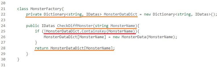 그 다음으로 몬스터를 생성하기 위한 몬스터 팩토리 클래스를 만들어 보도록 합니다. 여기서는 일단 딕셔너리에 넣어 주도록 하는데, 가장 중요한 것이 같은 이름의 몬스터가 아닐 경우에만 새로운 MonstaerData클래스를 메모리에 올리고자 하는 것 입니다.