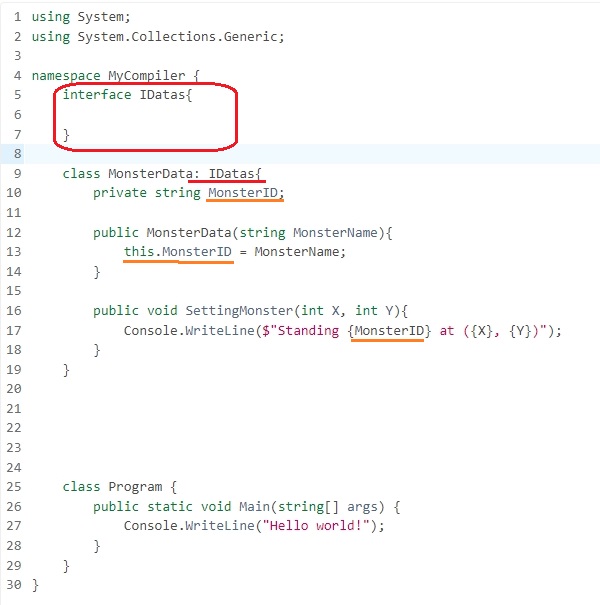 먼저 인터페이스 IDatas를 선언해 주고 나서, 다음으로 몬스터 데이터라는 클래스를 만들어 주도록 합니다. 여기서 중요한 것은 역시 클래스명을 선언하고 나서 public 클래스 명으로 클래스가 선언이 될 때 매개변수를 받아올 수 있도록 만드는 것 입니다.