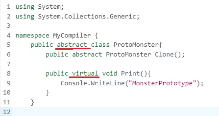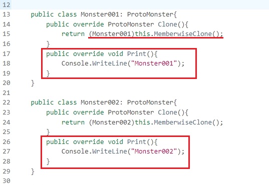 그리고 나서 다음으로는 생성할 몬스터를 Monster001과 Monster002라고 간단하게 이름을 붙였습니다. 그리고 나서 이 대상물을 실제로 복제해서 메모리상에서 올려주기 위해서 사용되는 코드인 MemberwiseClone()함수를 붙여 주도록 합니다. 그리고 나서 Print()메서드를 변형하기 위해서 override를 집어 넣도록 합니다.