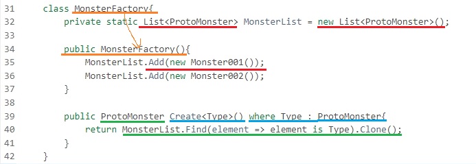 다음으로는 팩토리 패턴과도 연관되어 있는 내용물인데, 일단 클래스 안에 List형태로 프로토타입의 클래스를 저장시키도록 합니다. 그리고 Create<T>라는 메서드를 지정하는 방식으로 리스트 내에서 특정 형태의 클래스만 골라서 Clone명령어를 집어 넣어 줄 수 있습니다.