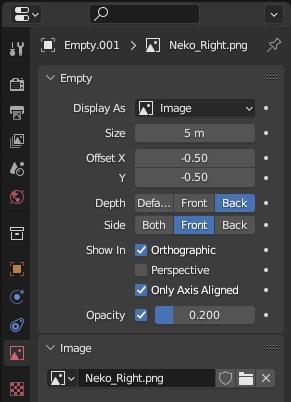 그리고 나서 프로퍼티스 윈도우로 가서 object data properties항목으로 들어가 도록 합니다. 아이콘은 위 스크린샷에서 볼 수 있는 것처럼 그림판 같은 아이콘을 클릭해서 들어가며, 이때까지도 오브젝트는 아까 참조로 추가시킨 이미지를 계속 선택하고 있어야만 합니다. 이런 상태에서 Depth(깊이)를 Back이라고 뒤로 두도록 하고, side라는 사이드는 앞쪽(front)로 두도록 했습니다. 그리고 나서 Show in 항목에 가서 Orthographic이라고 해서 정사법을 체크해 주도록 합니다. 그리고 나서 only Axis Aligned항목이라서 해서 축에다가 고정시키는 항목이 있는데, 이 역시 체크해 주도록 합니다.