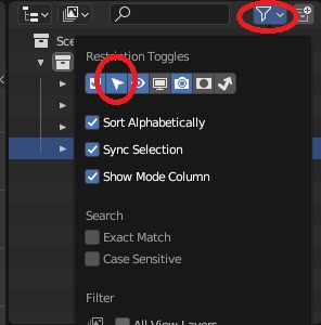 그리고 다음으로 중요한 것이 있는데, 바로 함부러 이 밑그림의 오브젝트인 Empty라고 되어 있는 오브젝트가 선택되지 않도록 조치를 취해 주는 것 입니다. 일단 맨 윗쪽의 깔데기 아이콘을 눌러서 클릭에 관여하는 화살표 아이콘을 글릭해 주도록 합니다.