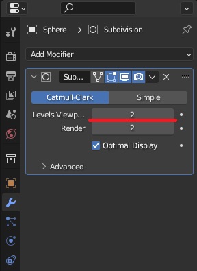 그리고 나서 다음으로 프로퍼티스 윈도우로 가서, 모디파이어 윈도우를 선택합니다. 그리고 Add modifier를 선택해서 subdivision surface를 선택해 줍니다. 다음으로 원래는 1로 되어 있는 수치를 위 스크린샷에서 볼 수 있는 것처럼 2로 바꾸어 주도록 합니다. 이렇게 하는 것으로 이제 다음으로 가면