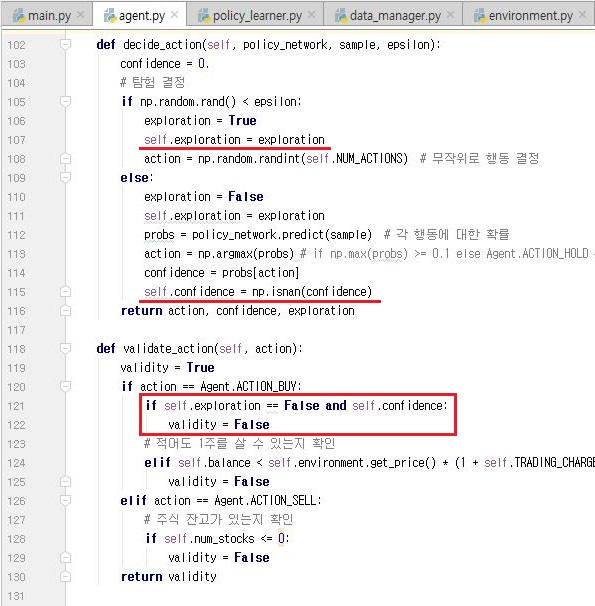 그리고 나서 agent.py로 가서, 아무런 결정이 나지 않았는데, 묻지마 매수를 하였는 행동을 하지 못하도록 만들어 주도록 합니다.