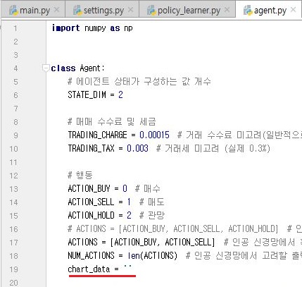 일단 클래스와 클래스, py와 py파일 사이를 뛰어넘기 위한 변수를 만들기 위해서, 먼저 agent.py의 Agent클래스에서 첫 메서드가 시작하기도 전에 위 스크린샷처럼 빈 변수를 하나 만들어 줍니다.