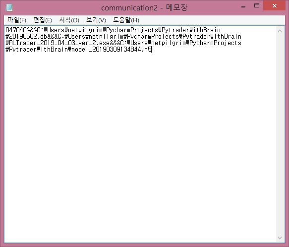 그리고 기존의 pytrader4를 복제해서 만들어 놓은 pytrader5에서는 위 스크린샷과 같이 communication2.txt라는 텍스트 파일을 읽어보도록 합니다.