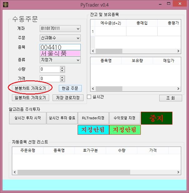 유유제약은 포기했으니, 이번에는 위 스크린샷에서 볼 수 있듯이 서울식품의 1분봉 차트를 가지고 오도록 해 봅니다. 이렇게 하는 것으로 이제 준비는 끝났습니다.