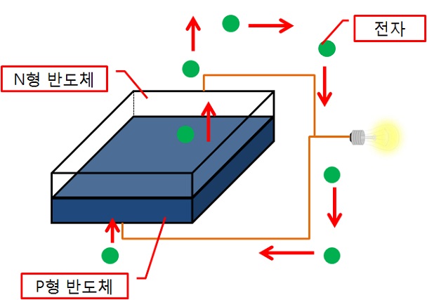 일반적으로 기존의 태양광 패널인 실리콘 패널의 경우에는 일단 n형 반도체와 P형 반도체의 접합부에 태양빛이 닿으면, 접합부에서 'n형 반도체 쪽으로' 전자가 이동하고 이러한 전자의 이동이 '전류를 발생'시켜서 전기를 생산하게 되는 것 입니다.