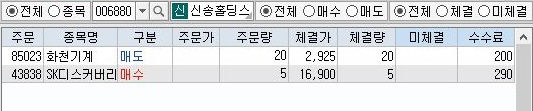 이제 14일의 투자로 넘어가서, 왜 인지 전날 SK디스커버리의 주식을 매도했는 것에 이어서 다시한번 매수를 하였고, 에러로 매수를 한 것이라고 생각이 되었는 화천기계의 주식을 어째서 인지 조건이 되어서 매도를 하는 것을 볼 수 있었습니다.