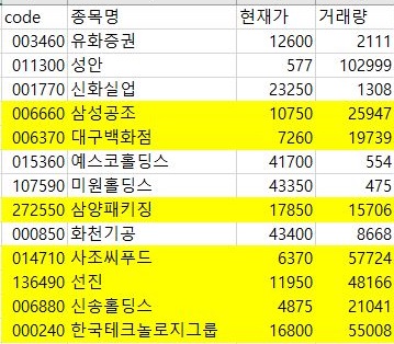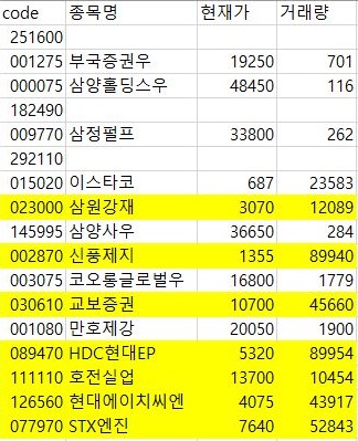 다음으로는 SecondClass에서 평균회귀 성향을 보이는 것으로 테스트를 3 종류 모두 통과한 종목들 중에서, 거래량이 1만 이상이면서 1주당 가격이 1000원 이상인 종목들을 모두 모아 보았습니다.