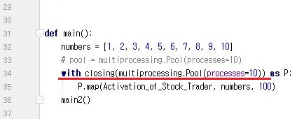 if __name__ == '__,main__':에서 위 스크린샷과 같이 main에서 with문을 이용해서 멀티 프로세스를 만들어 주도록 하고, 다음으로는 main2에서 main()을 부르도록 만들어 줍니다.