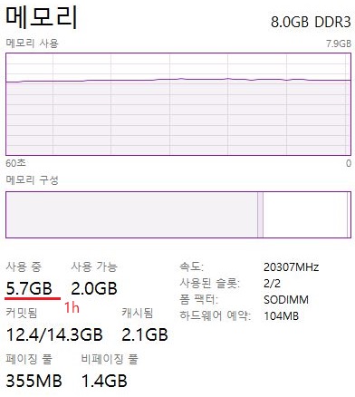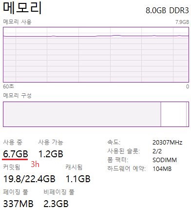 그리고 나서 1시간이 지나고 나서는 위 스크린샷에서 볼 수 있는 것처럼 비약적으로 사용되는 메모리의 양이 늘어난 것을 확인할 수 있었습니다.