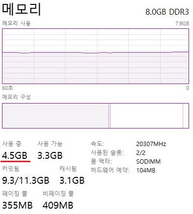 일단 30분이 지나고 나서 메모리 사용량을 체크해 보았습니다. 여기서는 4.5기가로 30분 전에 비해서 증가한 것을 볼 수 있기는 있었습니다.
