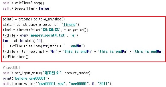 그리고 나서 계좌정보를 얻어오기 위한 코드 바로 직전에도 한번 비교 포인트를 박아 주는 것으로 해서, 계속해서 메모리 사용량을 비교해 봅니다.