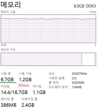 그래도 켜놓은 덕분인가요? 30분이 지났어도, 어떻게 메모리의 사용량이 그렇게 많이 올라간 것은 아니라고 하고 싶지만, 그래도 상당량 올라간 것은 사실입니다. 거의 1기가 밖에 남지 않았기 때문에, 이대로는 30분도 더 작동시키기 어렵습니다.