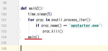 그리고 먼저 하는 것은 psutil의 process_iter()라는 함수를 이용해서, 작업관리자에 뜰 수 있는 모든 프로세스의 이름을 띄운다음, 이 프로세스와 opstarter.exe라는 이름이 같으면, if 조건문에 따라서 프로세스를 kill()하라는 명령을 내리는 것 입니다.
