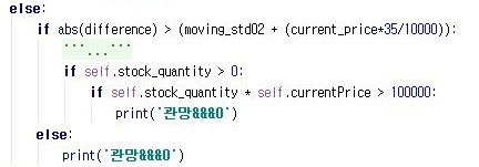 먼저 기존의 코드는 혹시나 모르기 때문에 일단 주석처리를 한 다음에, 그 다음으로는 위 스크린샷에서 볼 수 있는 것처럼 보유한 주식인지 아닌지를 먼저 체크하고, 만약 1주라도 보유를 했다면, 현재가 * 보유량을 계산해서 10만원 초과인지 체크해서 초과면 일단 관망만 하도록 만들었습니다.