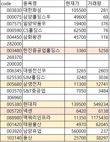 마지막 ThirdClass에서도 역시나 1만 이상의 거래량을 보유하고 있으면서 동시에 천원 이상은 되는 현재가가 되는-모의투자에 적합한 종목만을 고르다 보니, 5종목이 나왔습니다. 지금까지 나온 종목의 갯수만 따지면 14종목이 되기 때문에 큰 문제는 없어 보이지만, 일단 후보는 더 늘려 보도록 합니다.