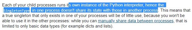 이래서 한번 찾아보니까, 싱글콘이 문제라고 하는 것을 볼 수 있었습니다. 이게 왜 문제인가 하면, 싱글톤이 한번에 하나만 만들어 지라고 있는데, 이걸 멀티 프로세싱까지 끌고 가는 것은 않 좋다는 것 입니다.