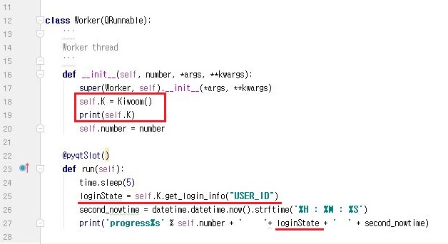 그리고 나서 로그인을 한 다음에 QRunnable에서는 싱글톤으로 되어 있는 위 스크린샷과 같은 식으로 Kiwoom()을 불러 오도록 합니다. 그리고 나서 유저 아이디를 가지고 오는 것으로 해 봅니다.