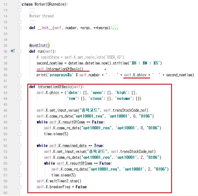 일단 처음으로 키움증권 서버에서 종목의 기본적인 정보 -시가, 고가, 저가 종가 = 현재가, 거래량을 가지고 오는 메서드를 만들어서 얘를 실행하도록 해 줍니다.