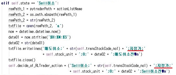 다음으로 두뇌역할을 하는 py파일로 가서, 여기서는 위 스크린샷에서 나오는 것처럼 일단 매도/매수 취소가 일어날 경우에는 일단 수량을 0으로 해서 미체결 수량을 모두 취소 시키도록 만들어 도록 해 봅니다.