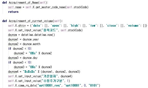 그리고 나서 하나하나 위 스크린샷처럼 메서드를 만들어 주도록 합니다. 여기서 나오는 것을 바탕으로 먼저 일봉차트를 가지고 오도록 합니다.