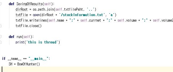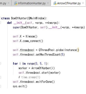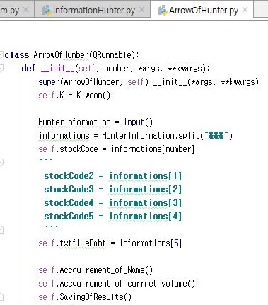 다음으로는 자식 프로세스로서 운용이 도리 ArrowOfHunter라는 py파일을 만들어 주도록 합니다. 이 py파일을 만들어서 운용하는 이유는, 한두개가 아닌 종목의 정보를 가져와야 하는데, 한번의 로그인으로는 1000회 조회제한이 있기 때문입니다.