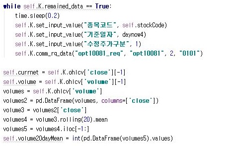 그리고 이어서 위 스크린샷에서 볼 수 있는 것처럼, 남아 있는 내용을 가지고 오도록 하고, 이후에 pandas로 바꿀 것은 바꾸도록 하고, 20일 평균 거래량도 구하도록 합니다.