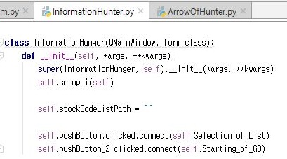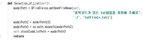 먼저 리스트를 가지고 오는 버튼을 지정해 주도록 합니다. 여기서는 종목코드가 있는 txt파일을 지정해 달라는 메세지를 띄우면서 QFileDialog를 이용해서 파일경로를 키보드가 아니라 GUI로 입력하러 가도록 만들어 줍니다.