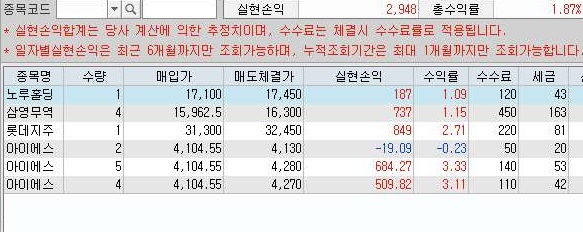 마지막으로 잔고의 확인입니다. 일단 예수금 자체가 늘어난 것을 확인할 수 있는데, 이건 매수가 일어났기 때문에 그만큼 늘어난 것이 아닌가 하는 생각이 듭니다. 일단 지금까지 진행상황을 보면, 100만원에서 시작한 조건이 전체적인 이익금의 양은 적은데, 수익률은 오히려 높은게 아닌가 하는 생각이 듭니다.