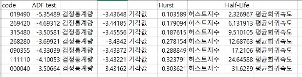 먼저 코스피의 결과를 엑셀에 옮겨서 보기 좋도록 만들어 주도록 합니다. 이 결과들은 한번 half-Life를 중심으로 해서 정렬을 하도록 하고, 2차 기준으로 허스트 지수를 해서 오름차순으로 정렬해 봅니다.
