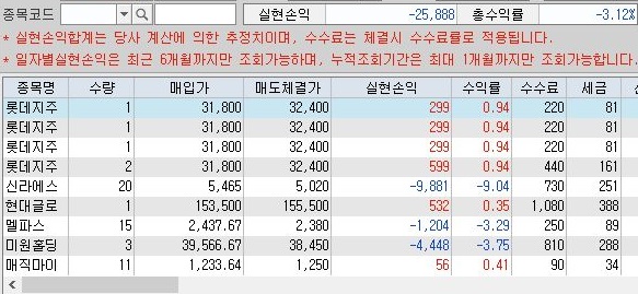 그리고 매도의 경우에는 시세자동감시기능을 사용해서 매도를 하였더니 위 스크린샷과 같이 주문가가 나오는데, 이게 생각외로 손해를 만드는 요소가 되기는 되었습니다. 그걸 제외하더라도 대다수의 매도가 26일에는 손해를 보는 것으로 나왔습니다.