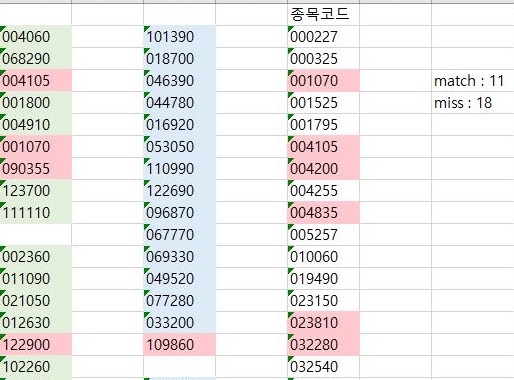 그리고 문제는 여기서만 끝나는 것이 아니라, 기존에 매수해 두었던 종목과 얼마나 겹치는 지를 한번 엑셀의 조건부 서식에서 중복값을 통해서 검색해 보았습니다. 그러했더니, 18개나 되는 종목이 1000만원으로 시작한 종목에서는 탈락했다는 것을 알 수 있었습니다.
