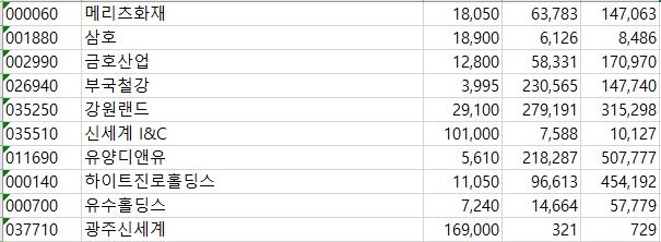 이렇게 해서 고르고 고른 종목들이 나왔습니다. 이 종목들에 대해서 한번 위 스크린샷과 같이 베이지색 배경은 바로 코스피, 그리고 파란색 배경은 코스닥의 종목들입니다.