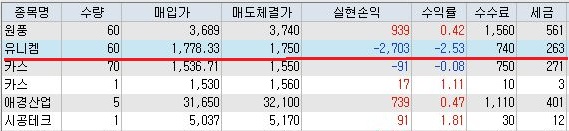 먼저 유니캠의 경우를 한번 살펴 보자면, 위 스크린샷과 같이 2700원을 넘는 손해를 기록한 것을 볼 수 있었습니다.