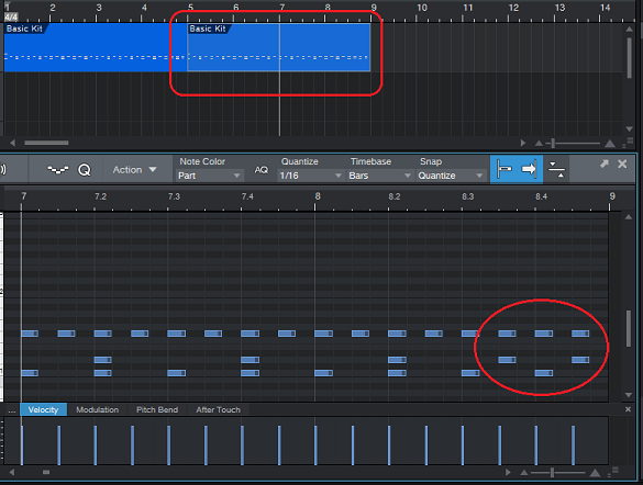 그리고 마지막 부분에서는 위 스크린샷처럼 기존에는 규칙적으로 움직이는 박자에다가 한번 새로운 노트를 하나 더 추가해 주는 식으로 변화를 주도록 합니다. 처음 했을 때는 이게 뭔 차이가 있는가 싶었지만, 실제로 해보면 큰 차이가 나오는 것을 확인할 수 있습니다.