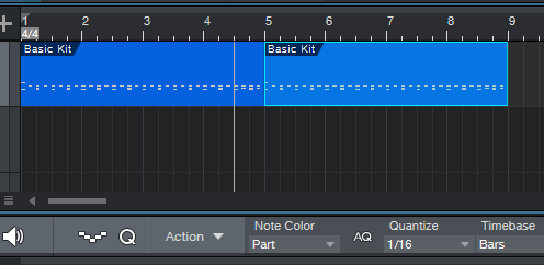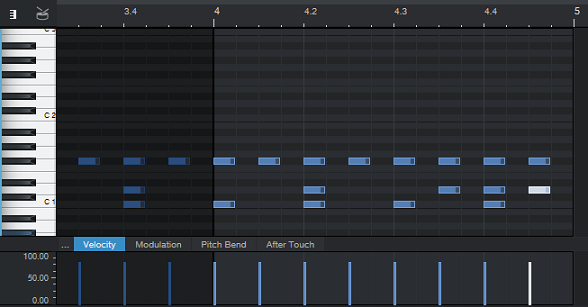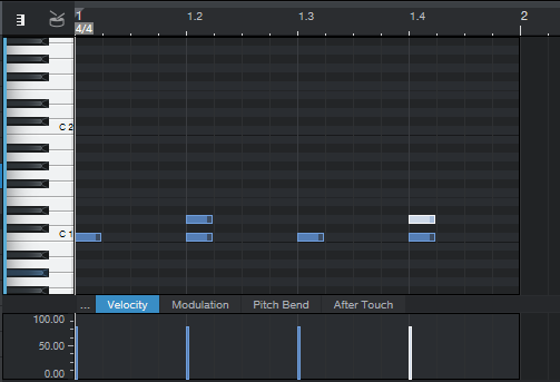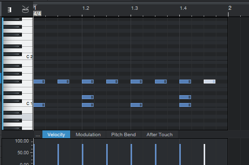 지난번 포스팅에서 끝낸 부분부터 이어서 하자면, 먼저 2초간의 한개의 리전안에 C1 노트-음표를 4개 배치해서 4박자를 만들었다면, 거기에 2개의 C#1 노트를 배치해서 한번 변화를 주도록 합니다.