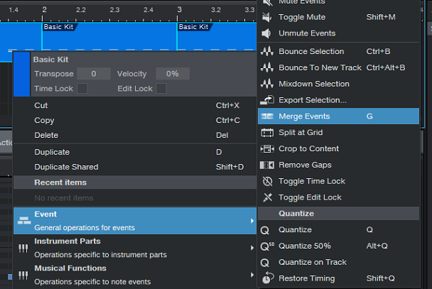 합치는방법은 위 스크린샷에서 나와 있는 것처럼 마우스 우클릭을 한 다음에, Event를 열어서 Merge Events라는 것을 선택하는 것으로 이루어 집니다.