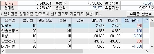 마지막으로 잔고를 확인하는 단계에 갔는데, 일단 위 스크린샷을 보시면 알 수 있듯이 총 수익률이 미약하게나마 마이너스인 것을 볼 수 있습니다.