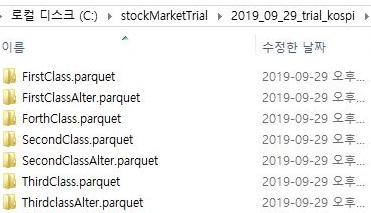 이렇게 해서 코스닥의 결과에서도 파케이 형식으로 된 파일들을 얻는데 성공했습니다. 이제 다음으로 해야 할일은 이 결과들을 보기 좋게 하기 위해서 엑셀로 정리하는 것 입니다.