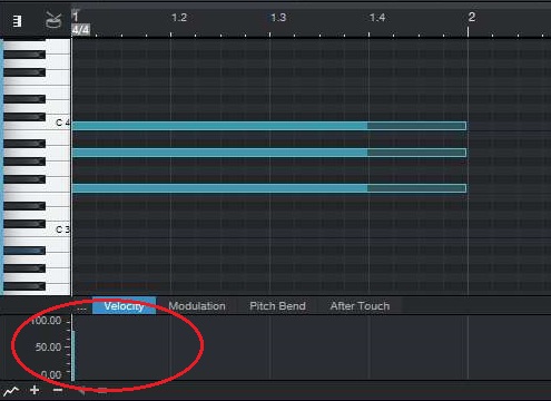 그리고 나서 C 메이저 코드라고 해야 할까요? 일단 마이너 코드에 대해서는 책에서는 슬픈 소리를 내는 정도라고 넘어가고 있으며, 여기서는 C로 시작하는 C4 A3 F3 의 코드를 입력하는데, 문제가 있습니다. 여기서 velocity라고 해서 음의 강도라고 해야 할까, 이 소리 크기를 같은 비율로 조절하지 않으면 의도하지 않은 소리가 나온다는 것 입니다.