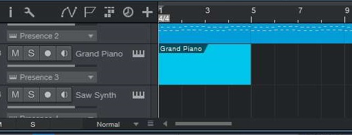 지지난번에 추가해 놓은 피아노 파트인 그랜드 피아노를 한번 위 스크린샷과 같이 만들어서 리젼을 지정하도록 합니다. 이렇게 하는 것으로 첫 발자국을 떼도록 합니다.