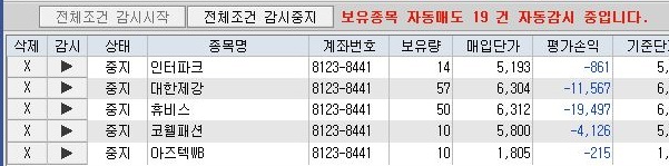 먼저 영웅문 HTS의 자동매매 감시 시스템을 가동 시켜서, 위 스크린샷과 같이 종목들을 모두 정리하도록 해 봅니다. 그런데 지난주도 이어서 계속해서 종목들이 처분되지 않는 것을 볼 수 있었습니다.