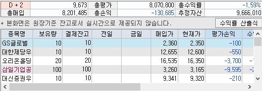 그런데 문제는 잔고를 확인해 보니, 대조군인 condition 1번에서는 상황이 그다지 좋지 않다는 것을 확인할 수 있기는 있었습니다. 일단 총 수익률이 더 떨어졌으며, 총 손익을 계산해 보면, 오히려 마이너스 입니다.