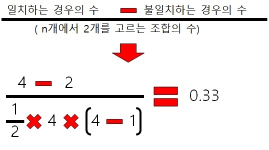 다음은 켄달의 순위상관계수를 구하는 방법입니다. 이 방법은 먼저 위 스크린샷처럼 두 선수의 각각의 대회별로 우열이 일정했는지, 역전이 되었는지를 한번 고려해서 우열이 언제나 일정한 경우를 일치한 횟수, 불일치한 횟수를 계산해야 합니다.