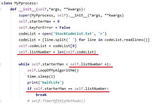 다음은 위 스크린샷처럼 이제 새로 만들어 놓은 평균회귀 테스트의 부모 프로세스의 내용을 바꾸어 보고자 합니다. 일단 처음으로 한 내용은 기존에는 키움증권 서버에서 일일히 가지고 왔는데, 그러지 말고 이번에는 방금 txt파일에 저장한 내용을 읽어 와서 리스트로 다시 바꾸는 작업을 하도록 만들어 줍니다.