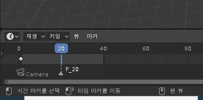 위 스크린샷과 같이 노란색의 마름모꼴 도형이 타임라인에 추가된 것을 볼 수 있는데, 이렇게 해서 1번 카메라의 키 프레임을 지정할 수 있습니다.