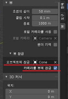 여기서 오브젝트를 원뿔로 지정해 주도록 하고, 그리고 나서 아래에 있는 카메라를 뷰에 잠금이라는 Lock Camera to view항목을 체크해 주도록 합니다.